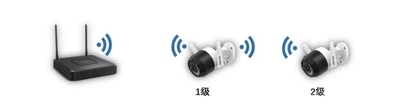 无线摄像机搭配无线录像机,通过使能IPC启用级联技术,可以将远距离点位桥接上信号强的点位,实现远距离、绕障碍传输。