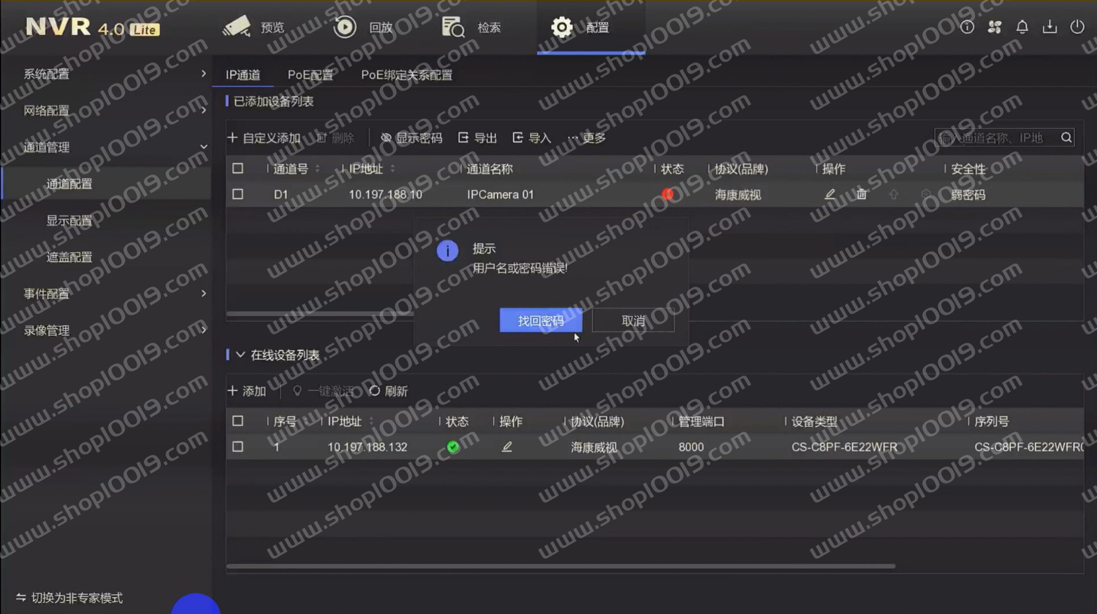 进入录像机配置-通道管理-通道配置,找到提示用户名密码错误的摄像机,点击此提示